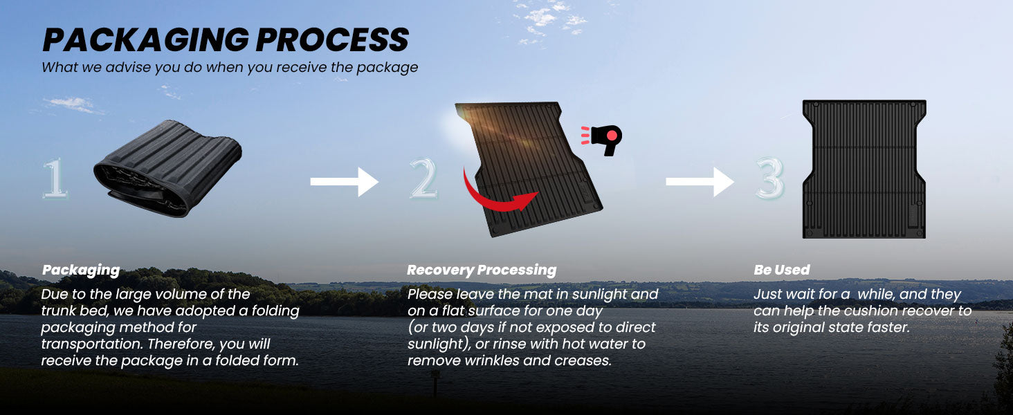 Our Product is folded in the package. Please leave the mat in the sun and on a Flat Surface for 1-2 days if not exposed to direct sunlight and it will return to original shape perfectly.