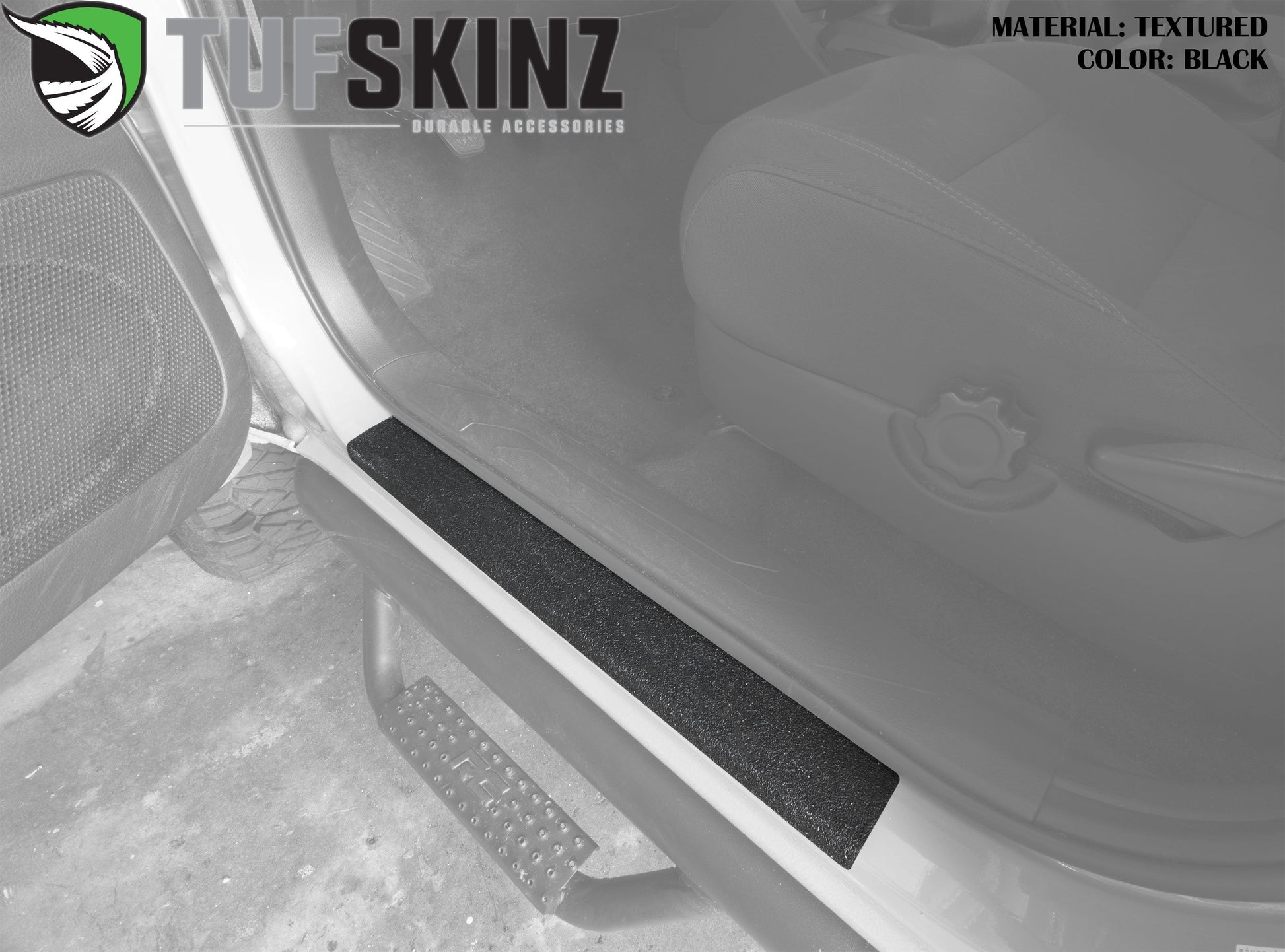 Our TUF-LINER material has a similar look/feel as spray in Bed-Liner. Each door sill is backed with a 3M Automotive Grade Adhesive that creates the perfect bond to the surface of the vehicle and makes the product installation an ease. Offered in a variety of designs options.